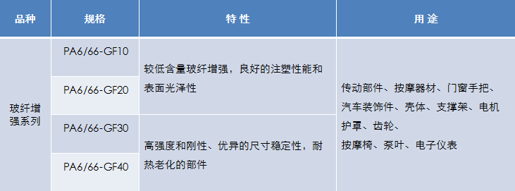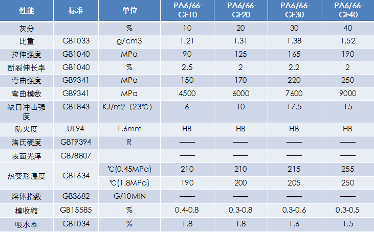 牌號(hào):PA6/66/66-GF10、 PA6/66-GF20、 PA6/66-GF30、 PA6/66-GF40